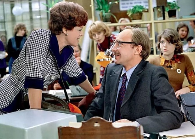 Или вот ещё пример, сцена из начала фильма, когда Самохвалов только появился в этом учреждении и секретать не обращала на него никакого внимания. Вот кадр из фильма.