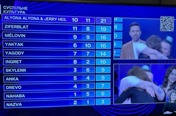 По сумме двух оценок победителями стали Jerry Heil и alyona alyona. Они и представят Украину на "Евровидении" 2024 года. Они победили на Национальном отборе и теперь выступят на международной сцене в Мальме, Швеция.