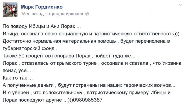 В глубоком тылу в Одессе патриоты единой Украины, не желающие идти на фронт, решили встать грудью против украинской же певицы Ани Лорак, провинившейся тем, что заявила о своей готовности гастролировать в Крыму. Патриоты явились к клубу, где Лорак выступала, и попытались сорвать концерт. После нападения на милицию они получили предсказуемый результат: их побили. Теперь патриоты в сетях угрожают «поджарить беркутню как колорадов 2 мая».