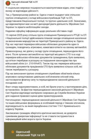 Тем временем Одесский областной ТЦК в своем комментарии обвинил в инциденте гражданских, которые оказывали "злостное сопротивление".