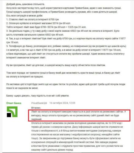 Тему превышения своего лимита на расчеты в интернете поднял и клиент с ником dimitrio, который рассказал, что установил лимит на оплаты в интернете на уровне 6700 гривен в сутки, но фактически сайт похитил с его счета 11 877 гривен. На это менеджер Приватбанка ответил сообщением, что финучреждение применяет лимит не ко всем оплатам в сети, а только к подозрительным.