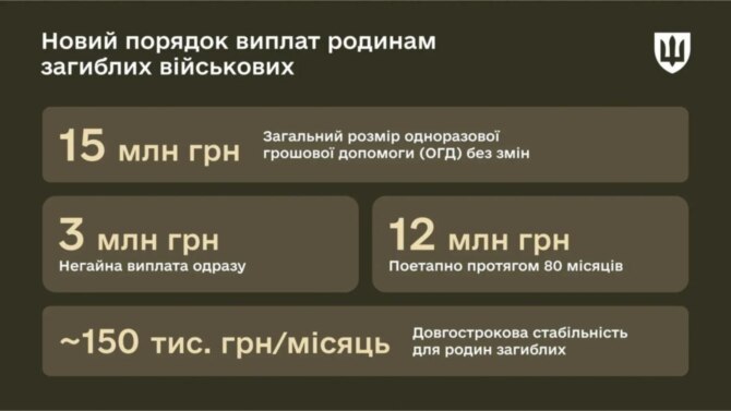 "Выплата 1/5 части от общей суммы (3 млн грн) будет осуществляться немедленно. Выплата 4/5 от суммы помощи (12 млн грн) будет проводиться поэтапно в течение 80 месяцев по фиксированному графику", – заявили в Минобороны.