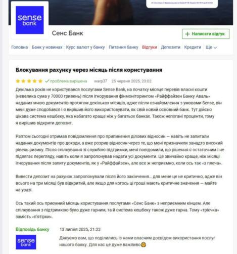 Например, бывший клиент "Райффайзен Банка" в своей жалобе сообщил, что Sense Bank после перевода остатка средств заблокировал счет в течение месяца.