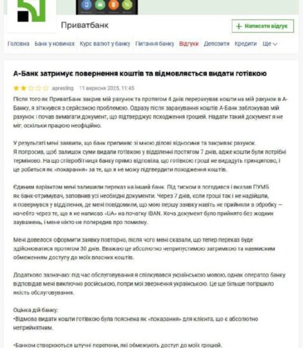 "Сразу после зачисления средств "А-банк" заблокировал мой счет и начал требовать документ, который подтверждает происхождение денег. Предоставить такой документ я не мог, поскольку работаю неофициально. В результате мне заявили, что банк прекращает со мной деловые отношения и закрывает счет. Я просил, чтобы остаток средств выдали наличными, но работница банка прямо ответила, что наличными не выдадут принципиально, и это делается как наказание за то, что я не могу подтвердить происхождение средств", — поведал клиент "Приватбанка" и "А-банка" под ником apresting.