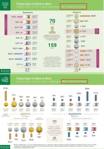 НБУ сообщил, что на 1 октября 2025 год на купюры достоинством 500 грн. и 1000 грн., приходилось, соответственно, 26,6% и 17,1% (43,7% вместе) всего банкнотного ряда. В то время как перед войной показатели были в 1,7 раза меньше: 22,4% на 500 грн. и 2,7% на 1000 грн., то есть 25,1% всех банкнот.