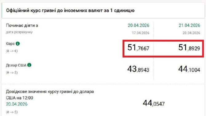 Регулятор установил на 21 апреля новый исторический максимум по курсу гривна/евро на уровне 51,8929 грн./€. Доллар тоже подорожал: его официальный курс поднят с 43,8943 грн./$ до 44,1004 грн./$ и остановился недалеко от предыдущего пика в 44,1636 грн./$, который был достигнут 14 марта.