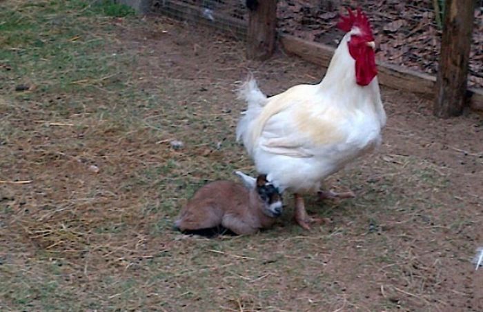 Козленок считает петуха своим родственником.