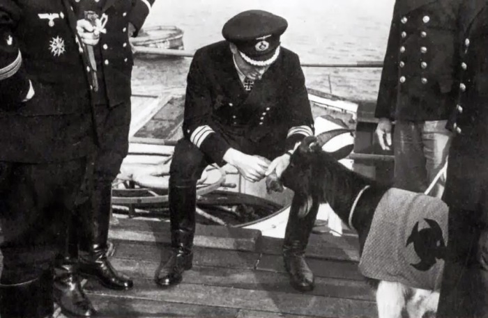 Леманн–Вилленброк кормит козла в попоне с эмблемой 9–й флотилии. Франция, Брест, 1944 год.