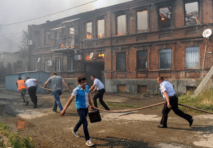 11. Полицейские и муниципальные работники тушат пожар в городе Ростов-на-Дону, Россия