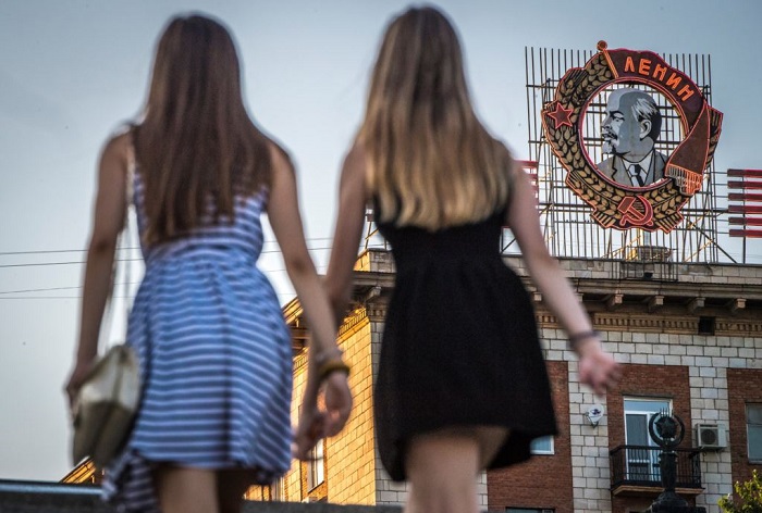 12. Девушки возле здания с символикой Владимира Ленина в Волгограде, Россия