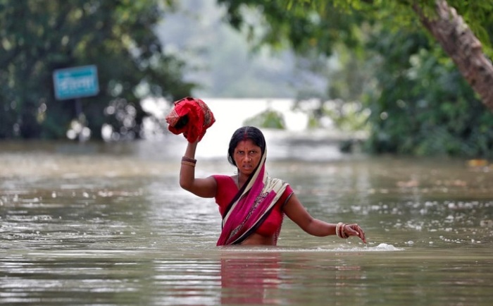 4. Женщина, пробирающаяся через затопленную деревню в восточном штате Бихар, Индия