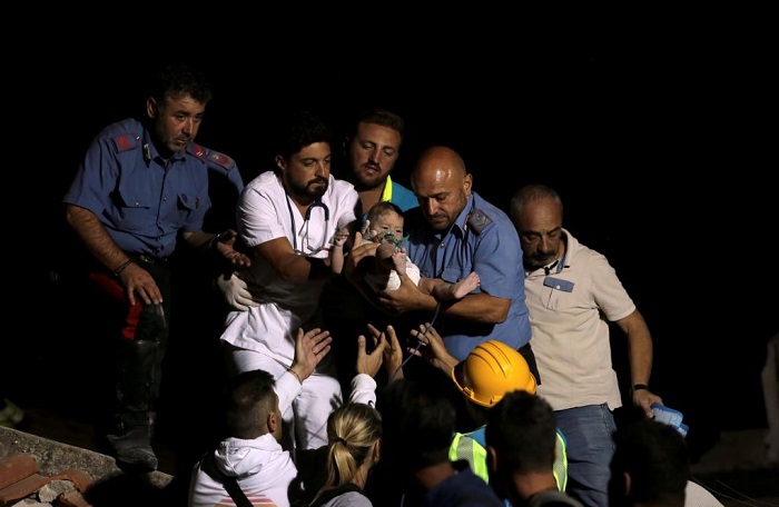 8. Полицейский и врач несут спасенного после землетрясения ребенка, Италия