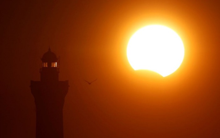 9. Маяк Экмюль на закате во время частичного солнечного затмения, Франция