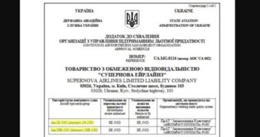 Украинские авиационные власти сообщили, что Агентство по авиационной безопасности Европейского союза (EASA) выдало украинской авиакомпании Supernova Airlines разрешение на полёты грузовых бортов в Европу.