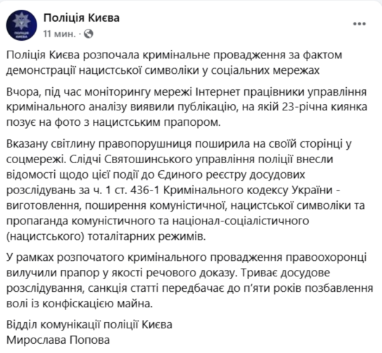 Сообщается, что вчера, во время мониторинга сети Интернет, работники управления криминального анализа обнаружили публикацию, на которой 23-летняя киевлянка позирует на фото с нацистским флагом.