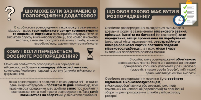 Оригинал личного распоряжения военнослужащего ВСУ регистрируется в воинской части и направляется на хранение в ТЦК и СП, откуда происходила мобилизация. Если военный относится к другим формированиям, приобщается к его личному делу.