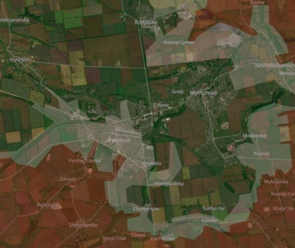 К северу от обоих городов - у Красного Лимана и Родинского - идут ожесточенные бои, россияне там пытаются атаковать в сторону перекрестка с дорогой на Гришино и в сторону Мирнограда, пишет украинский военный эксперт Константин Машовец.