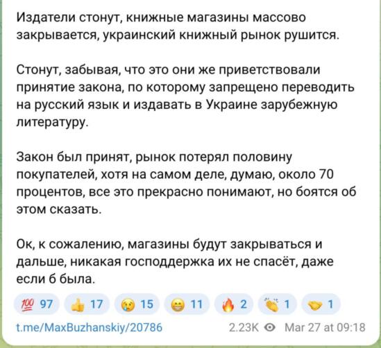На публикацию отреагировал народный депутат Максим Бужанский. Он заявил в своем телеграм-канале, что стонущие из-за закрытия магазинов издатели "забывают, что это они же приветствовали принятие закона, по которому запрещено переводить на русский язык и издавать в Украине зарубежную литературу".
