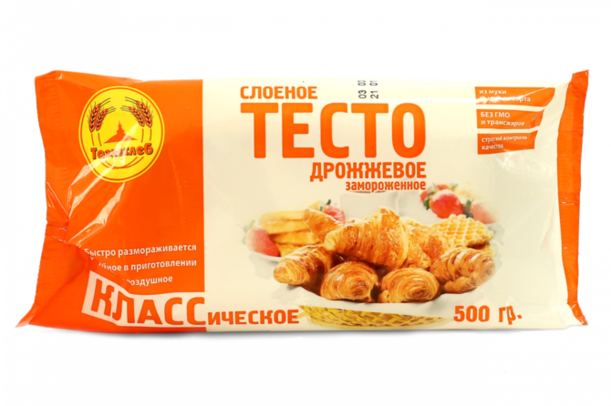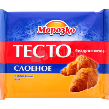 Там, в холодильных камерах, среди пельменей, вареников и блинов в пачках от 0,4 кг до 1 кг продается слоеное тесто. Эти две картинки даны не в качестве рекламы торговой марки теста, а для тех, кто не знает как оно выглядит. В помощь молодым и начинающим кулинарам.