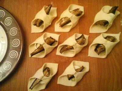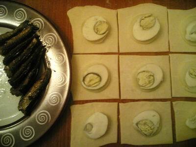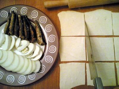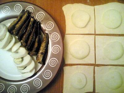 И в заключение на кружочки яйца каждого квадратика кладем по одной (две маленьких) шпротинке.