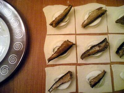 Если делаете с луком, то на каждый квадрат выложить по 1 кружочку лука. Еще вкуснее будет, если лук сверху смазать майонезом.