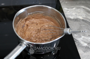 Для крема примерно треть сметаны нагревайте вместе с кусочками шоколада и порцией какао в сотейнике на среднем огне при помешивании.