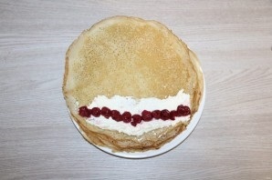 шаг 15. Повторите ещё слой блинчиков и залейте заливкой. Поставьте в холодильник для застывания на 2-3 часа.