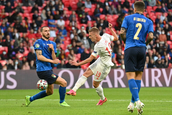На 25-й минуте ошибся уже Доннарумма. Он выбил мяч от своих ворот прямо на соперника. Последовала быстрая атака испанцев и Ольмо оказался на ударной позиции в центре штрафной площади. Пришлось голкиперу Италии исправлять свой же огрех и он сделал это мастерски, парировав коварный удар с близкого расстояния.
