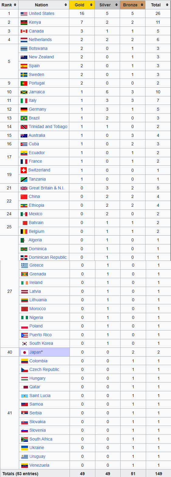 Победителями медального зачета чемпионата мира-2025 с большим преимуществом стали американцы. В целом награды завоевали атлеты 53-х из 198 стран-участниц. Любопытно, что безмедальным этот чемпионат мира оказался для норвежцев с их звездами Ингебригтсеном и Вархольмом в составе.