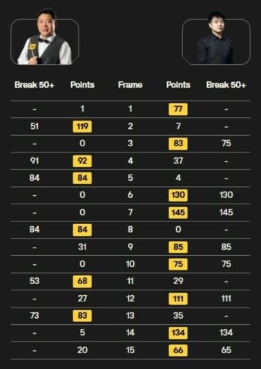 13-й фрейм выиграл Чжан с брейком 73 (счет 6:7), однако в остальной части матча он набрал всего 25 очков, тогда как Чжао уверенно закрыл три последних фрейма сериями 134, 65 и 131. За пять матчей турнира Cyclone оформил в общей сложности девять сенчури-брейков и еще 17 серий свыше 50 очков (10:6).