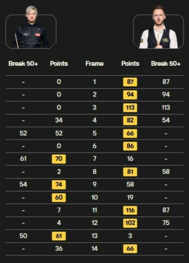 36-летний Трамп из Бристоля вышел в свой четвертый рейтинговый финал сезона и 53-й в карьере. Он нацелен на 32-й рейтинговый титул, что оставит его всего в одном титуле позади Хиггинса в историческом списке. Джадд до этой недели не выигрывал ни одного матча на Tour Championship шесть лет, но после побед над Марком Алленом, Шоном Мерфи и Робертсоном он находится в шаге от одного из немногих трофеев, которые до сих пор ему не покорялись.