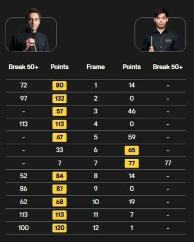 По ходу встречи Ракета продемонстрировал высокий уровень игры, оформив несколько крупных серий. В его активе – три сенчури-брейка (113, 113, 100 очков), а также еще 5 полусотеттных (97, 86, 72, 62 и 52). Усилий Хэ Гоцяна оказалось недостаточно, чтобы навязать борьбу.
