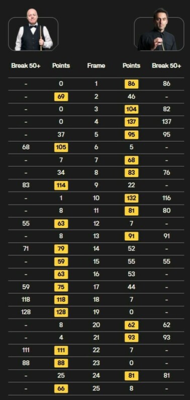 Это была седьмая встреча Эль Класико между О’Салливаном и Хиггинсом в Крусибле, и теперь шотландец ведет 4:3. Также он одержал первую победу в их очном противостоянии с 2021 года, прервав серию из трех поражений.