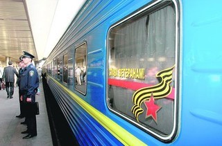 В четверг вечером из Киева в Москву с 1-го пути отправился «поезд Победы» — в СВ-вагонах он повез 14 украинских ветеранов (среди них две женщины), отобранных Советом ветеранов Украины для участия в российском военном параде. Под звуки военных маршей и «Прощание славянки» фронтовиков провожали чиновники, около десятка школьников, пассажиры других поездов и просто прохожие. Окна ветеранских вагонов (их прицепили к поезду №6 «Киев—Москва») украсили наклейками в виде георгиевских лент и надписей «Слава ветеранам». «Скудновато, конечно. Можно было более торжественно нарядить поезд», — заметил один из ветеранов-пассажиров.