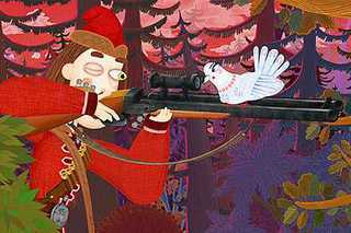 Царь ажно дрожит, к карете бежит. Дверцу открывает — чуть не умирает. Ноги подкосились, с башкою не спросились. В карете сама она — атомная война. Носище крючком, зубища торчком, ухи вразлёт, зеньки наоборот, дыхание гнилище, такое страшилище. Вообче чудеса, куда делась краса…