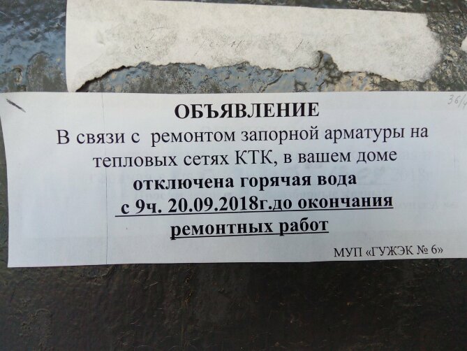 Объявление:"Сегодня в нашем доме в связи с ремонтными работами с 9 до 16 часов будет прекращена подача воды, тепла и электричества".